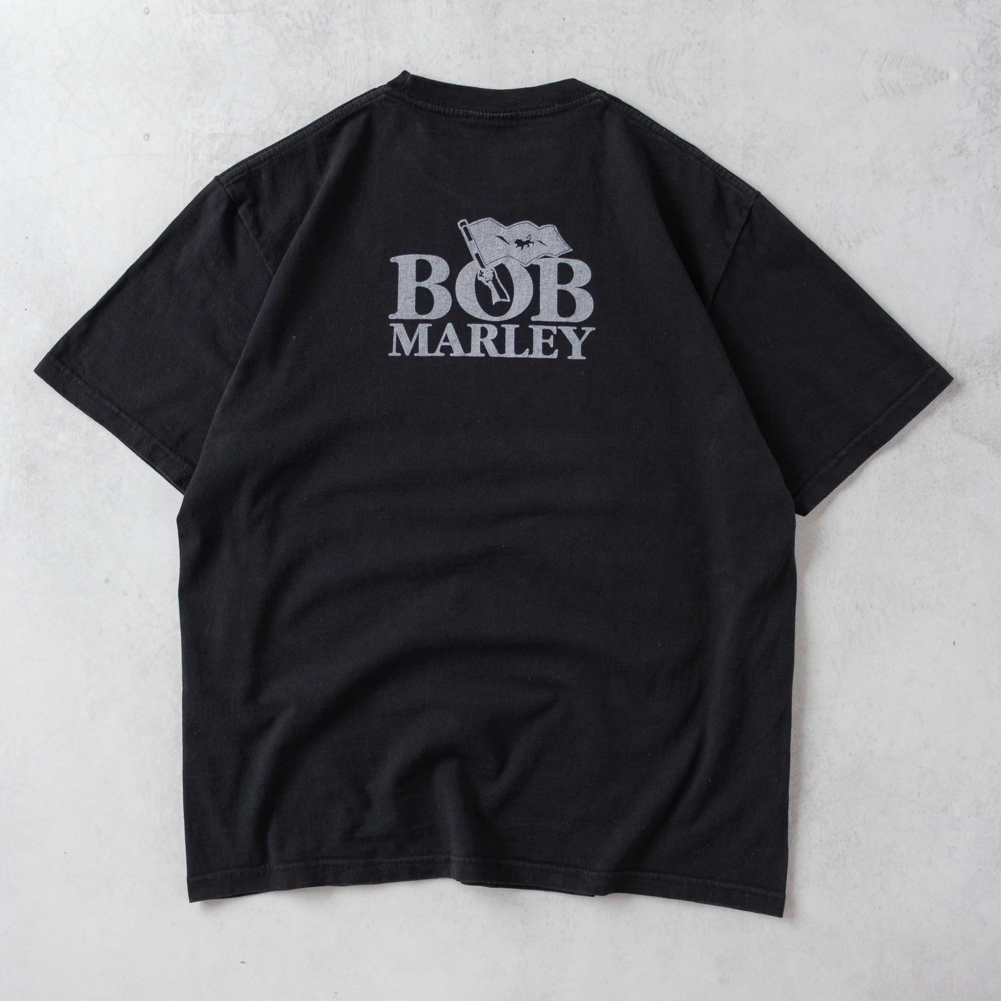 Rap tee style front graphic on the front. Bob Marley hit on the back.
