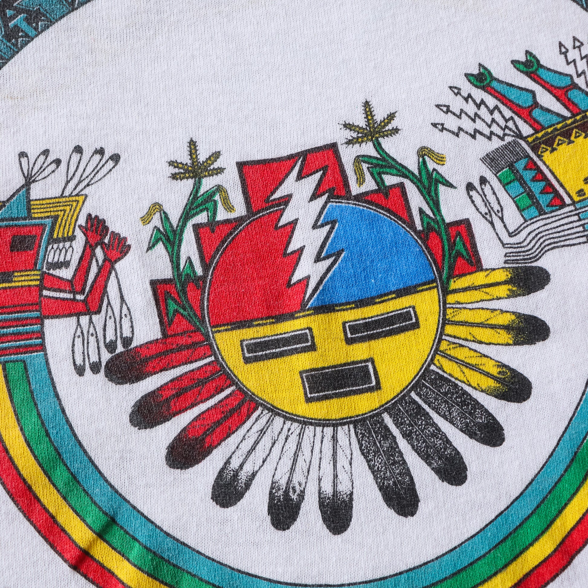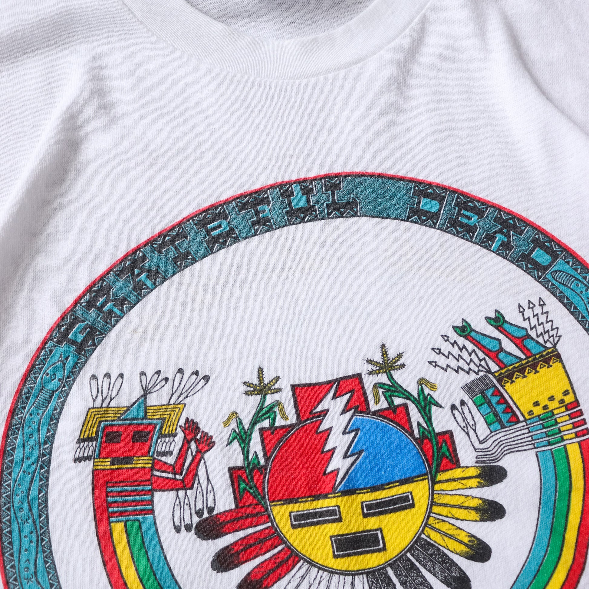 Zuni style sun face graphic with snakes and Southwestern detailing on the front, full city tour list on the back.